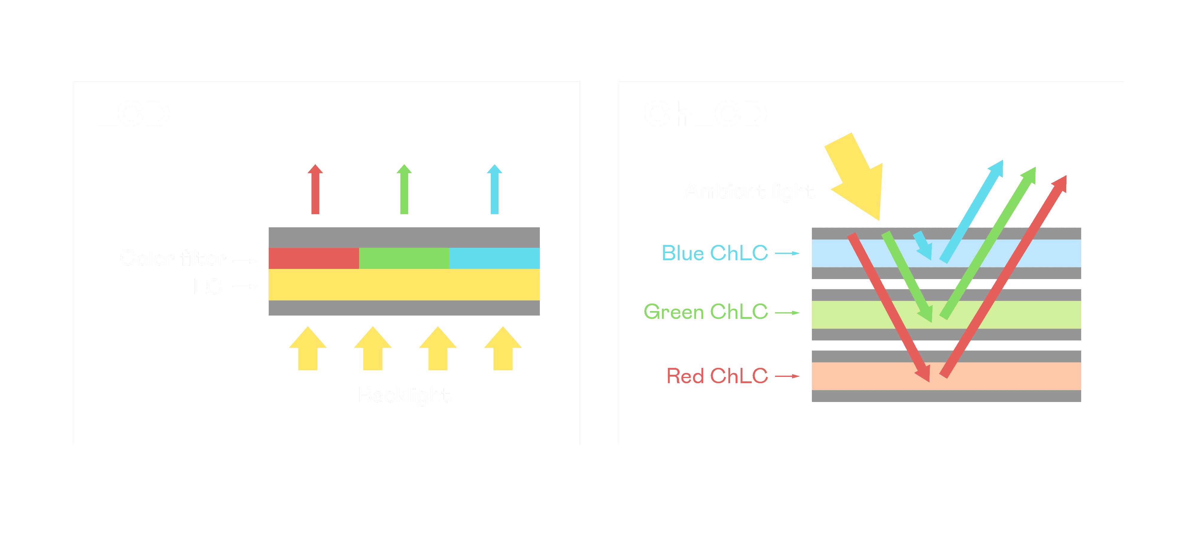 ChLCD 胆固醇液晶就如同纸张一样,,,透过反射环境光来显示影像,,,,因此长时间观看不易造成人眼视觉疲劳,,,,可达到护眼效果。。当处于户外阳光下使用,,,,LCD 影像容易失真而不易观看,,但胆固醇液晶仍可维持较佳的影像品质。。。。