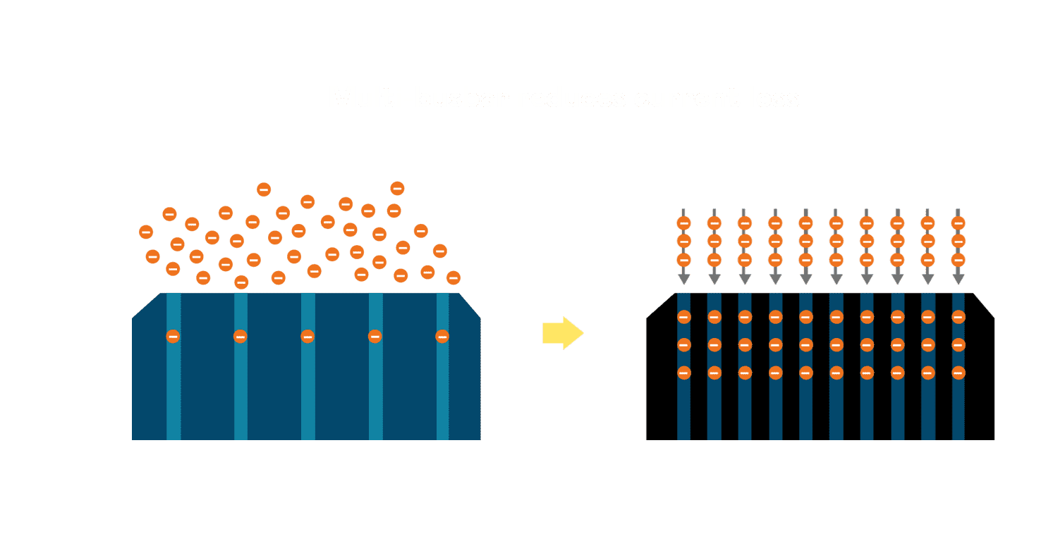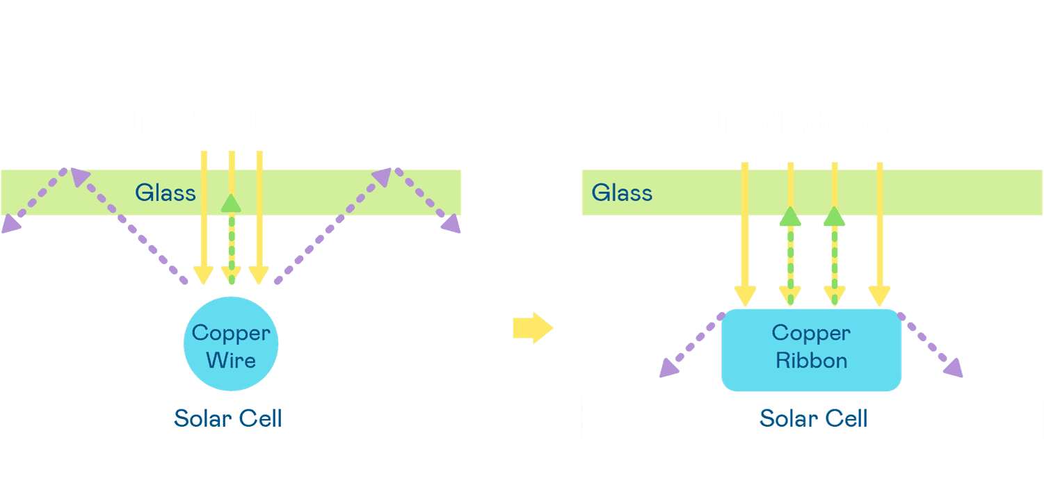 - 电池使用多条铜导线 (Copper wire) 于电池片上形成较短的电流路径,,,提高电流收集效率,,采用圆形设计的铜导线较传统扁平式的铜焊带 (Ribbon),,,可增加入射至电池的光线量。。。